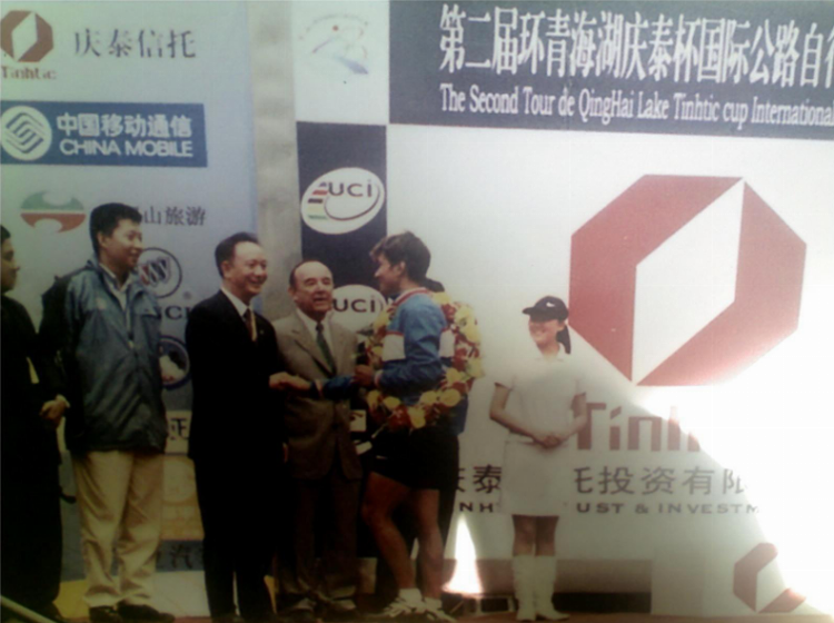 第二届环湖赛,武英董事长与国自盟官员巴意一起为黄杉得主:香港 自行车队黄金宝颁奖现场